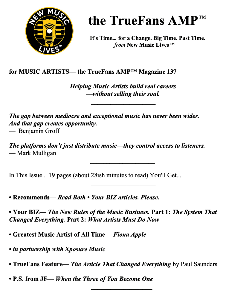 • Your TrueFans AMP™ 137 • Your BIZ— The New Rules of the Music Business. Part 1: The System That Changed Everything. Part 2: What Artists Must Do Now • Greatest Music Artist of All Time— Fiona Apple • in partnership with Xposure Music • TrueFans Feature— The Article That Changed Everything by Paul Saunders • P.S. from JF— When the Three of You Become One.