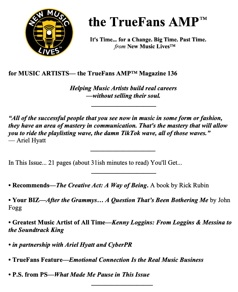 • the AMP 136— The Creative Act: A Way of Being. A book by Rick Rubin • After the Grammys… A Question That’s Been Bothering Me • Kenny Loggins: From Loggins & Messina • Emotional Connection Is the Real Music Business and more...